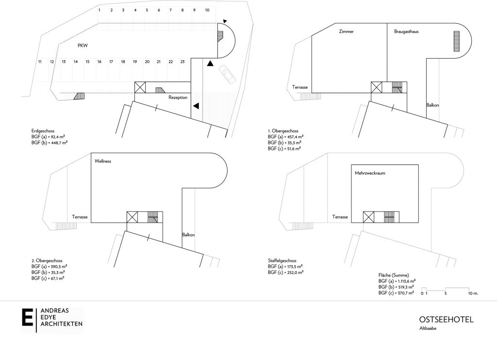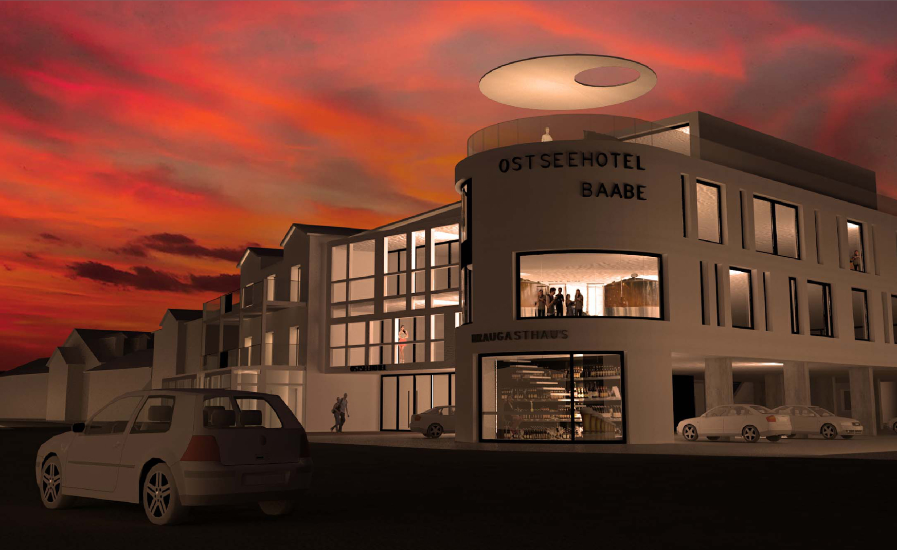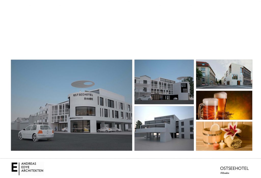 Unser Vorschlag: Ein 3-geschoßiger Neubau auf dem seitlichen Parkplatz. Die Gäste parken weiterhin im EG. Darüber Flächen für ein Braugasthaus, weitere 10 Hotelzimmer sowie für Wellness und Feierräume.